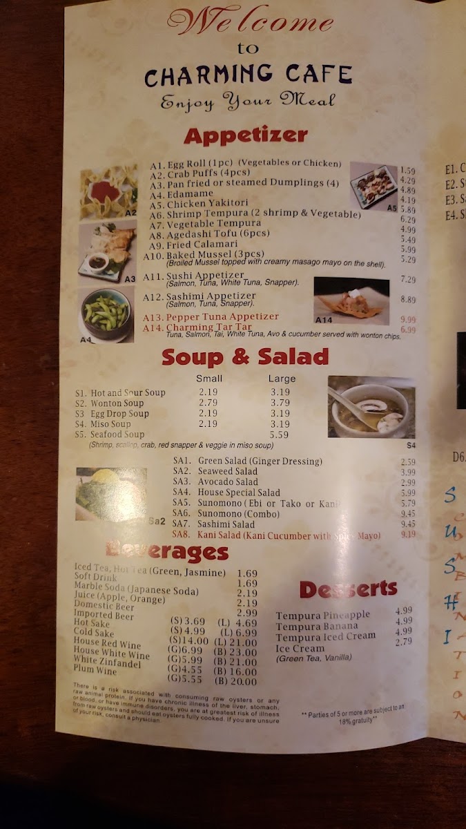 The menu at Charming Cafe offers a straightforward and inviting selection that reflects its Japanese roots while catering to casual dining moments. Here, you’ll find a balance of comforting favorites and fresh sushi options, with dishes that are both satisfying and approachable.